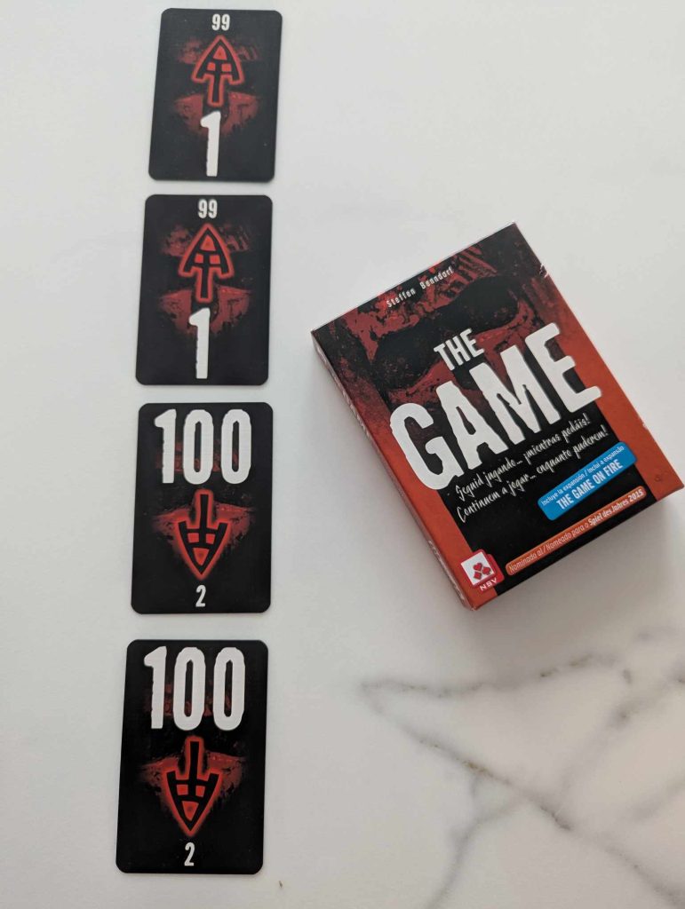Colocamos las 4 cartas de inicio (2 ascendentes con el número 1 y 2 descendentes con el número 100) en el centro de la mesa formando una columna (tened en cuenta que iremos poniendo cartas hacia la derecha).
