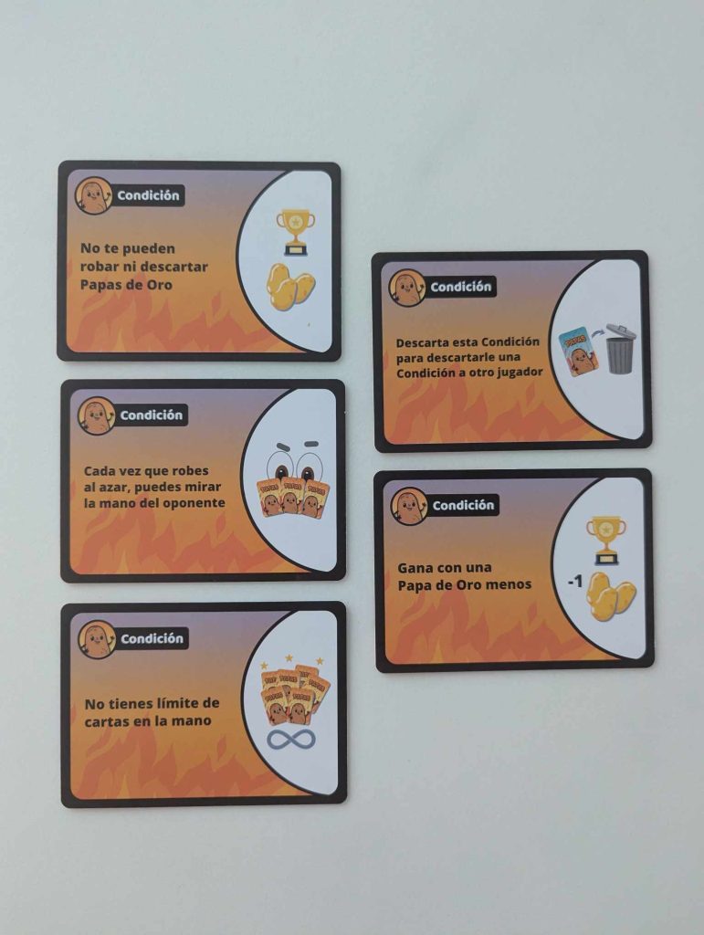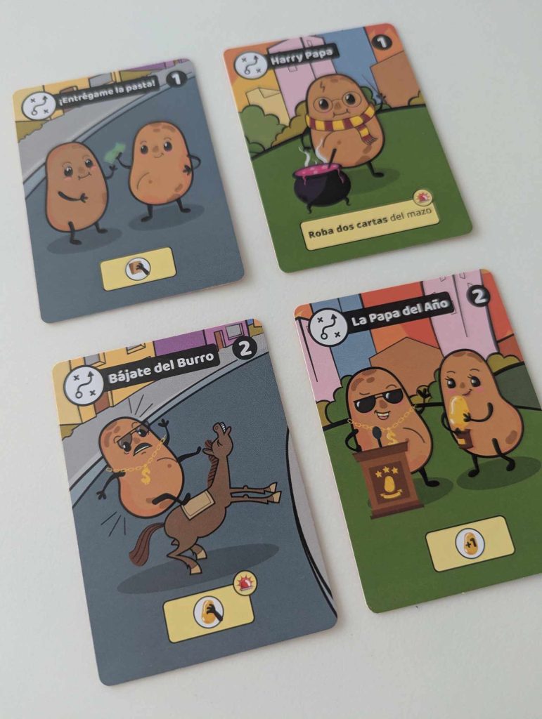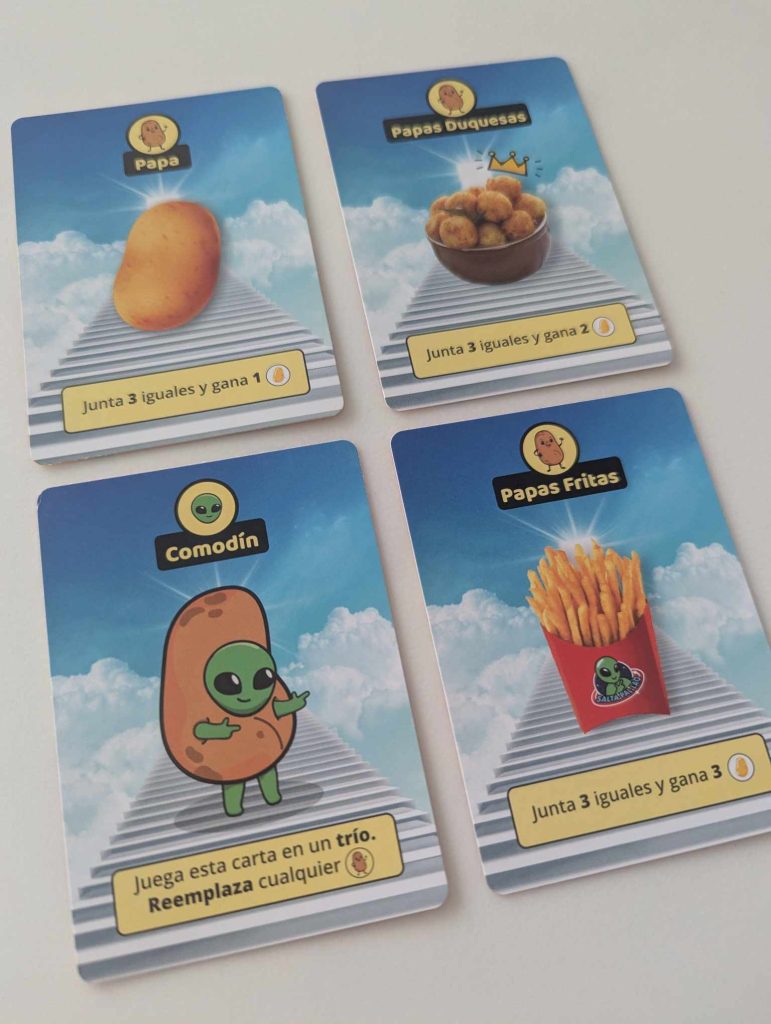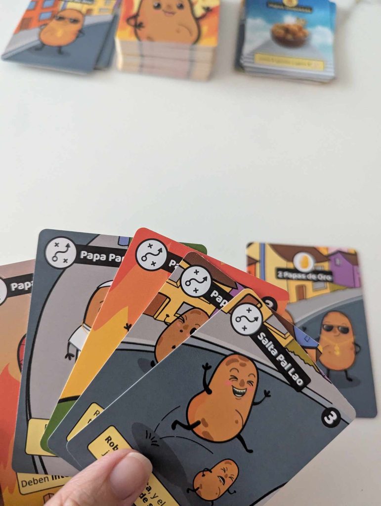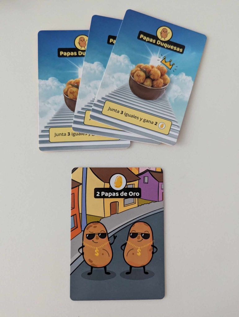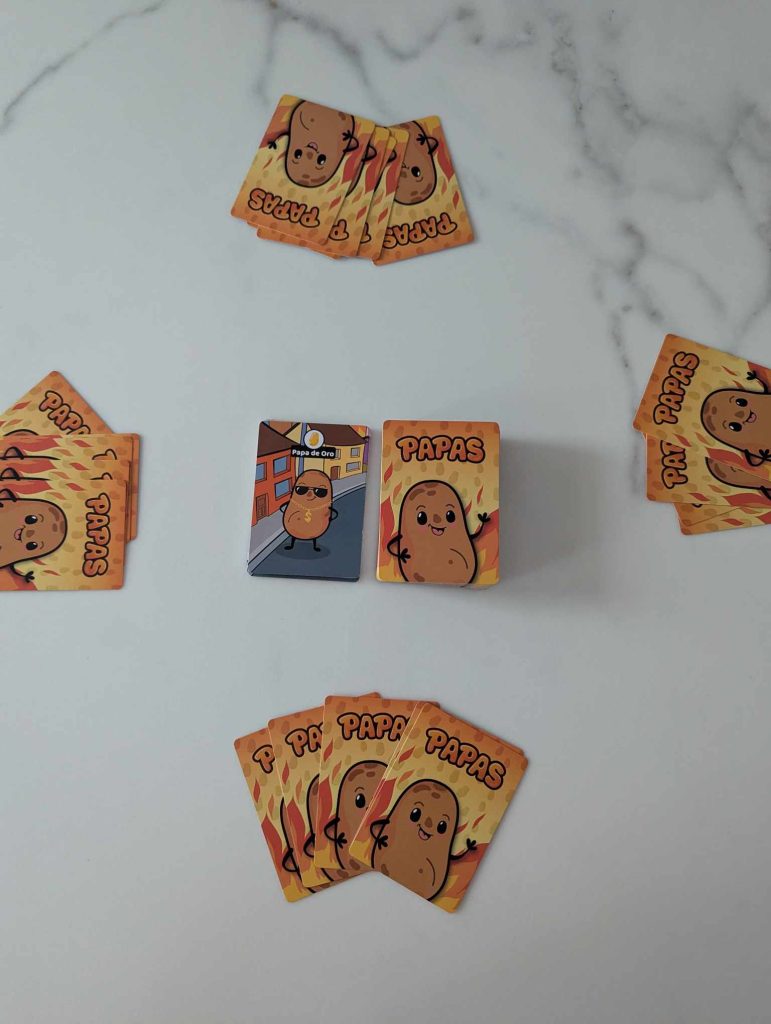Repartiremos a cada jugador 5 cartas. Haremos un mazo de robo y un mazo de cartas de Papas de oro, dejaremos también espacio para el mazo de descarte.