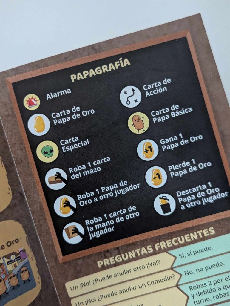 En el manual de instrucciones, nos resuelven también preguntas frecuentes que pueden surgir con el juego, disponemos también de «papagrafía» que explica las acciones de las cartas. Hay algunas situaciones que pueden dar lugar a confusión y no están descritas.
