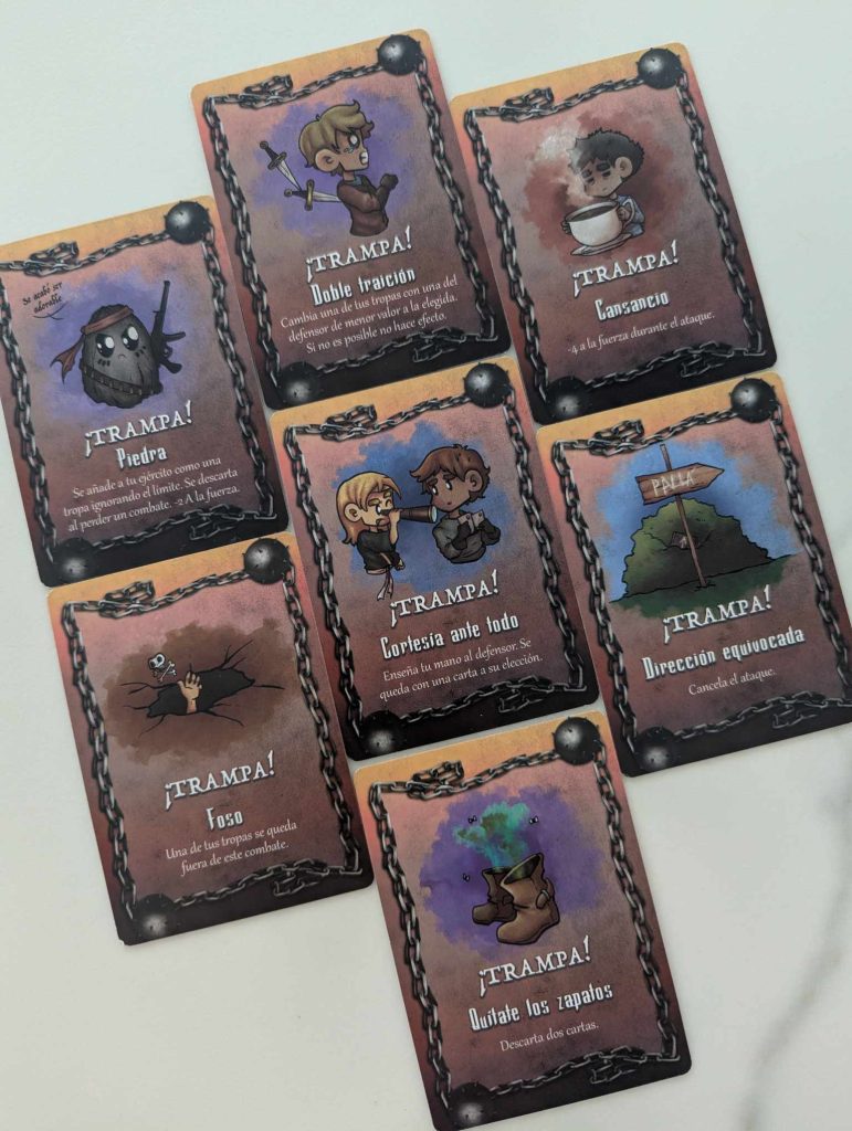 - Trampas: para protegerte de ataques, se colocan boca abajo delante de tu ejército. Solo podemos tener 1. Puedes colocar cualquier carta boca abajo, pero si un atacante la revela y no es de trampa, se la queda y no hace su efecto.