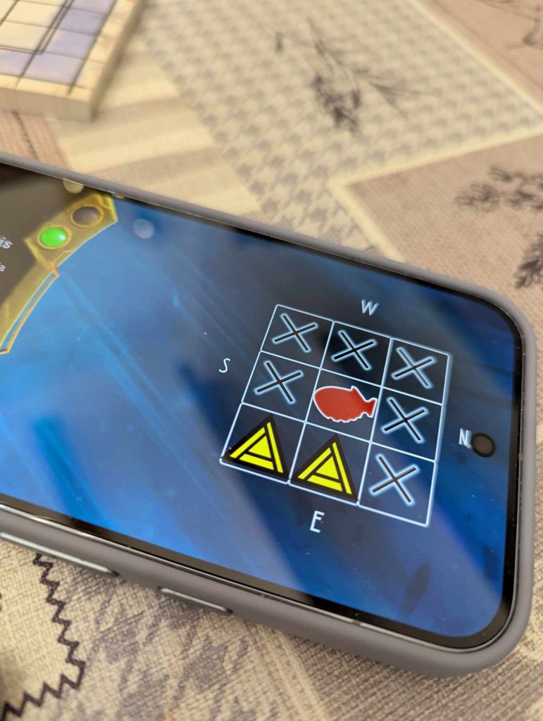 - Podemos quemar una carta para mover el submarino, tocando el botón 🔥 y escaneando el anverso. Se moverá hacia el norte.