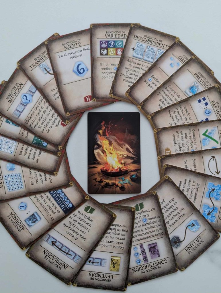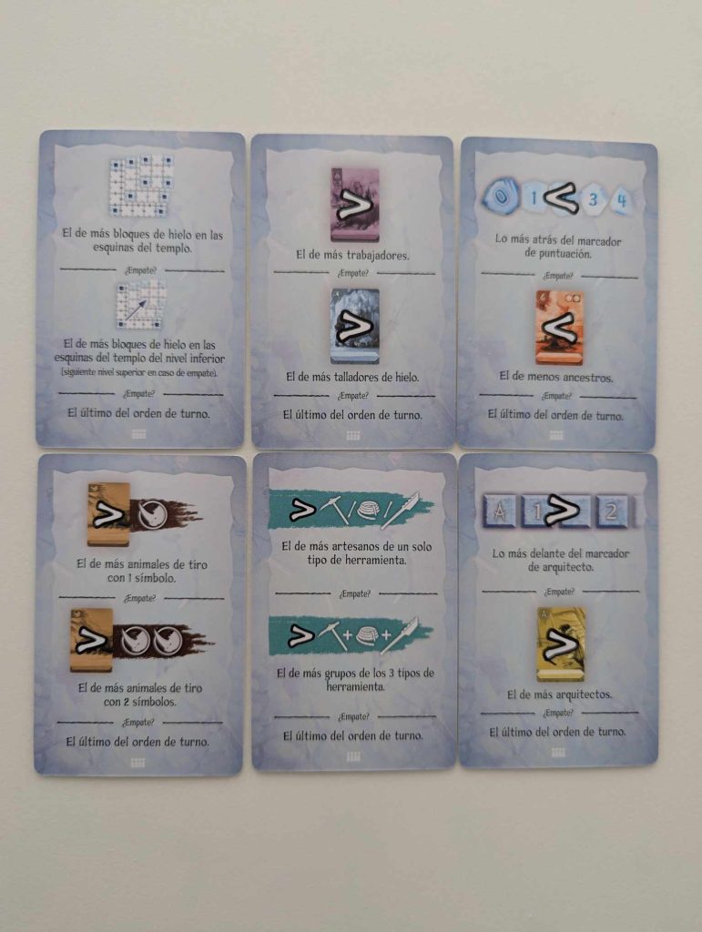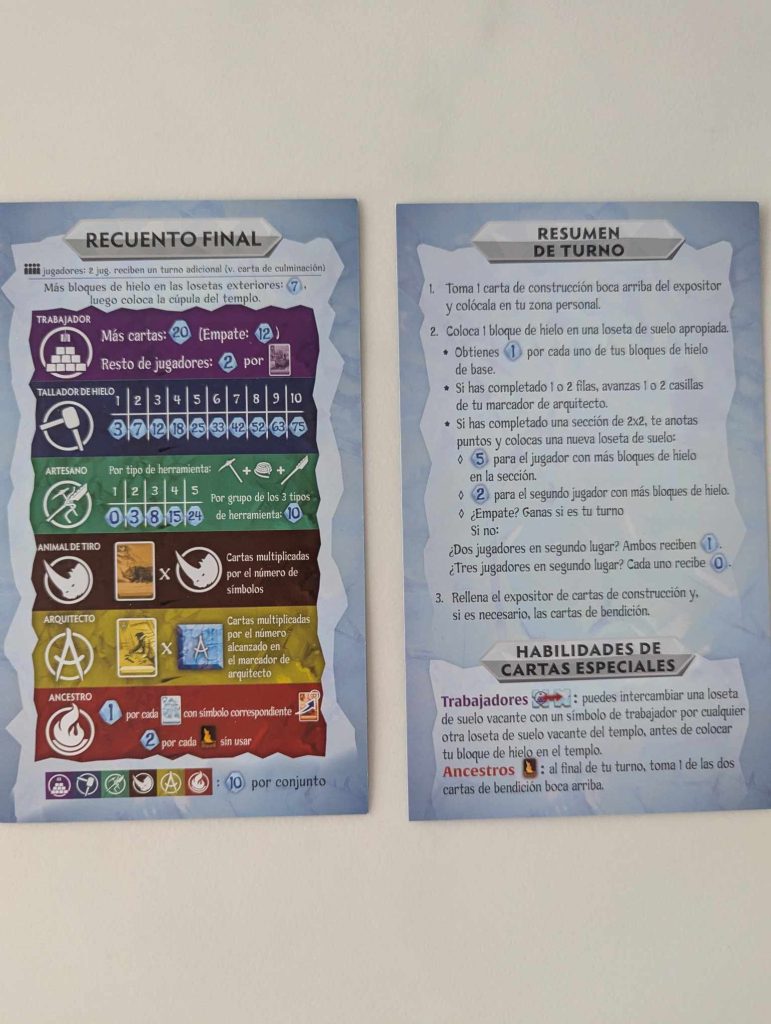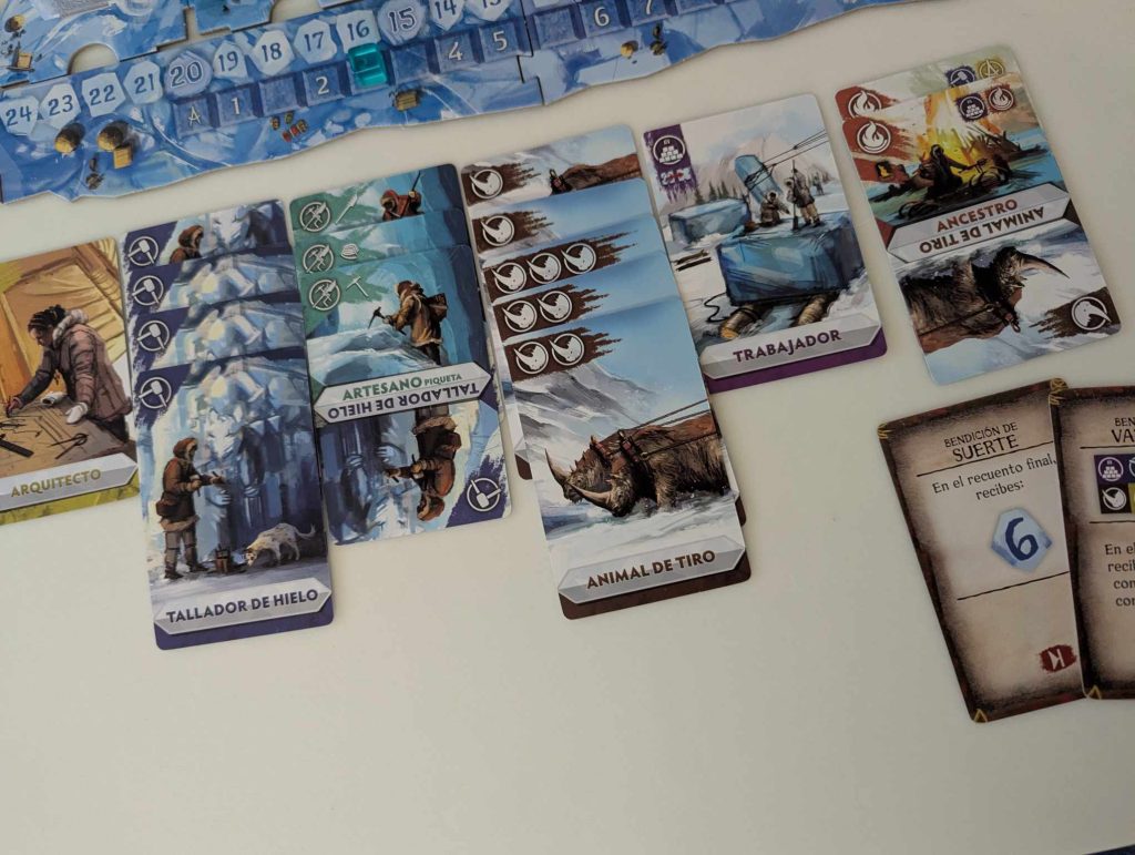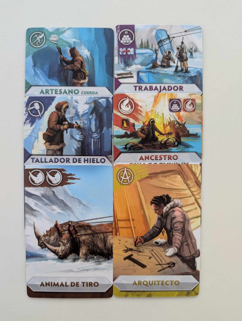 Las cartas de trabajador y ancestro ofrecen ventajas especiales durante la partida, con el trabajador podemos intercambiar losetas de hielo con símbolo de trabajador y con la de ancestro, podemos coger una carta de bendición (que se puede jugar, según indicación, en el momento, recuento final o «x1» que no se puede usar en el turno en el que ha sido cogida).