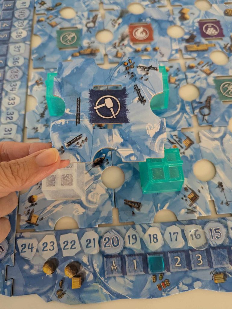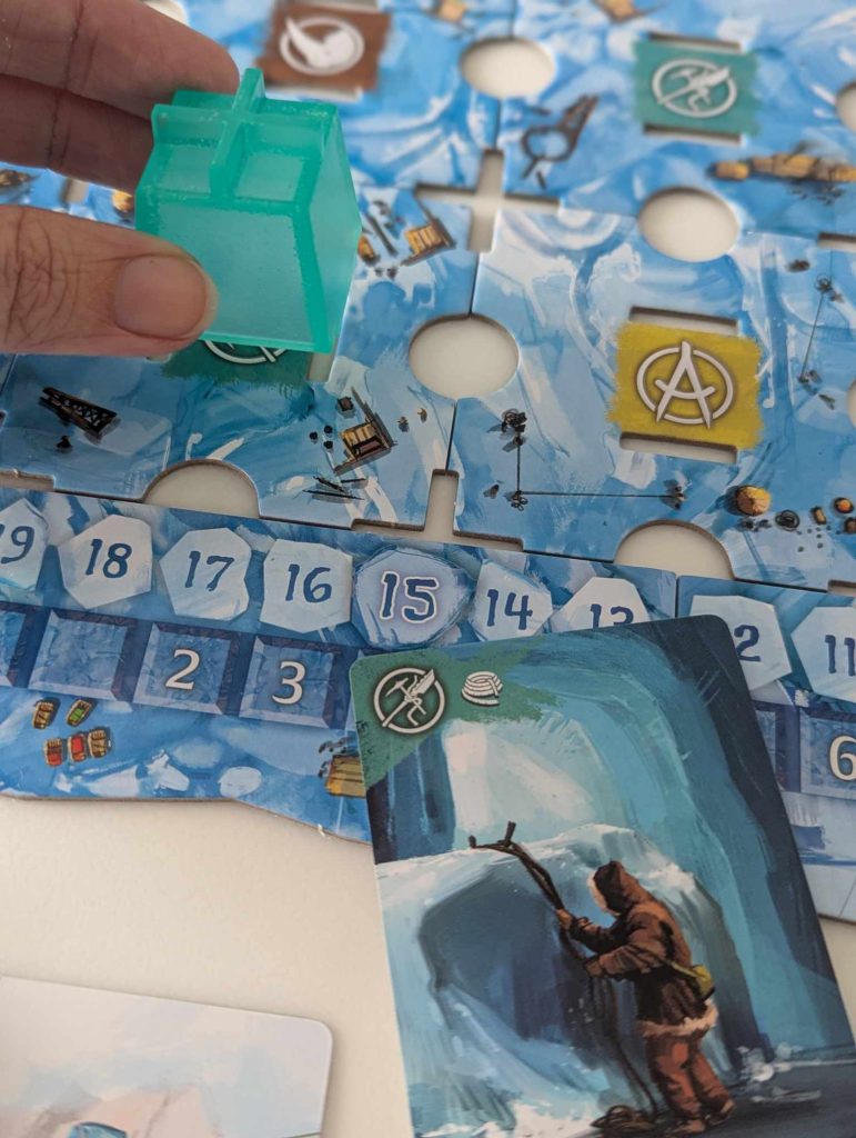2. Coloca 1 bloque de hielo en una loseta de suelo cuyo símbolo coincida con la carta que acabas de coger. Si has completado 1 fila, avanza 1 espacio por cada fila completada en el marcador de arquitecto (si completas 2 de golpe, avanzas 2, puedes llegar como mucho a 10).