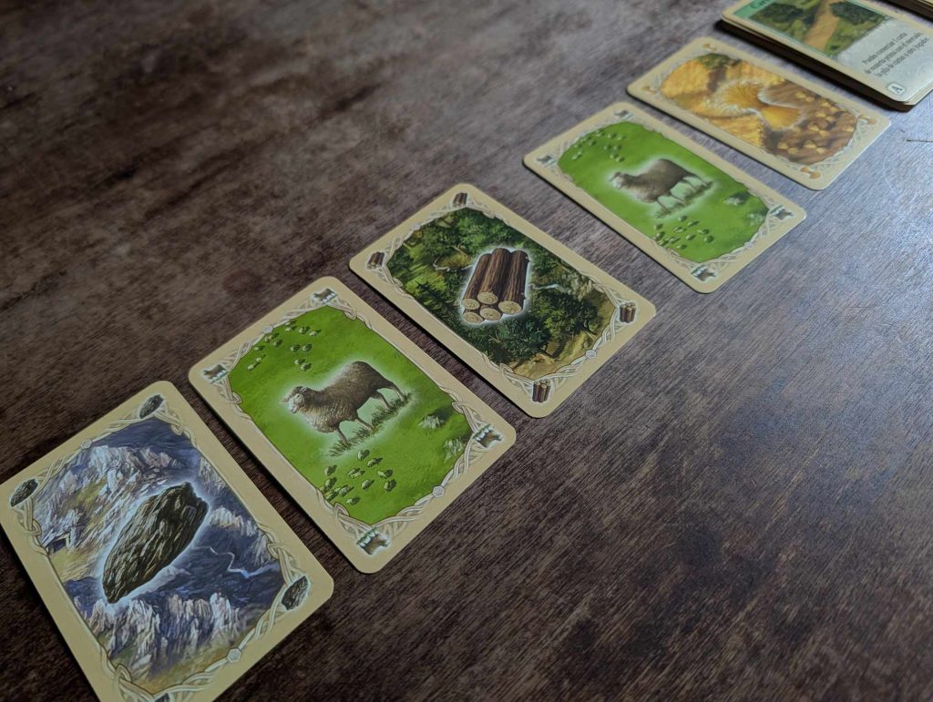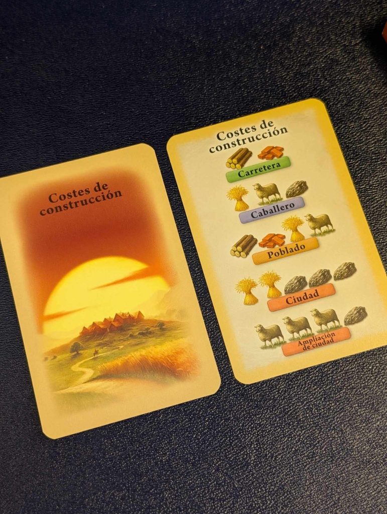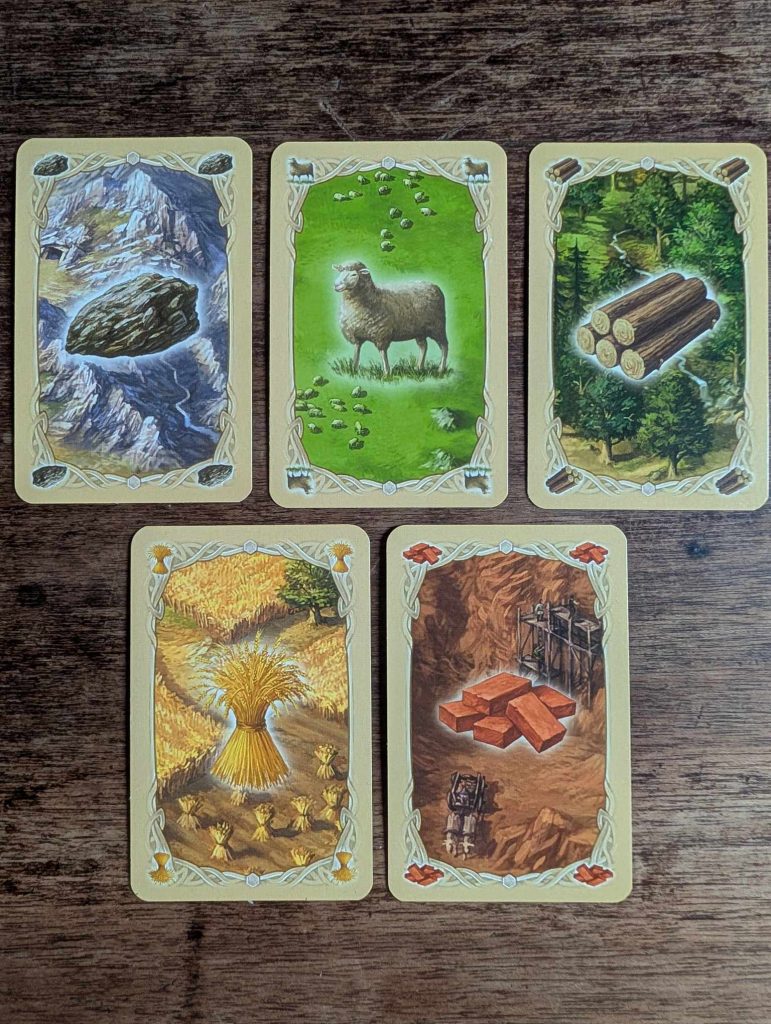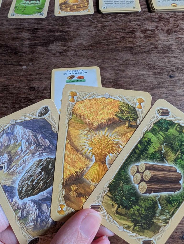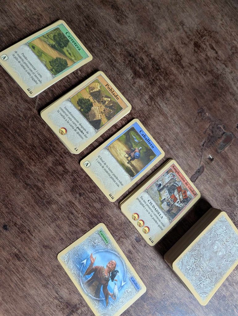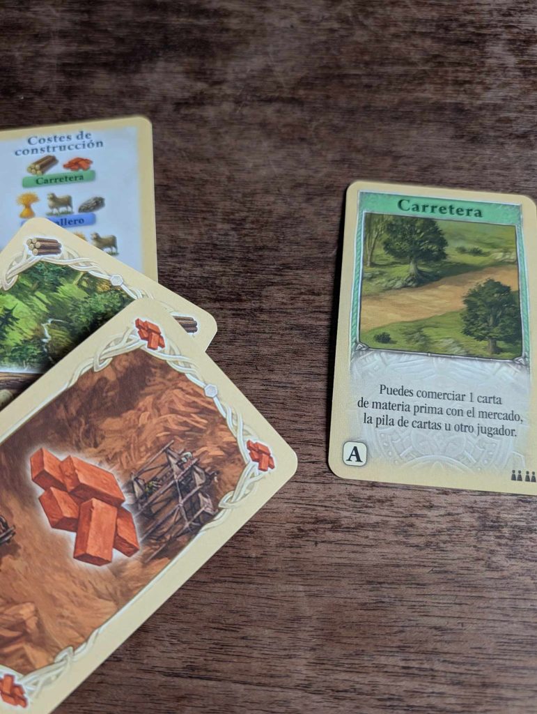 Separamos las cartas de construcción por tipos (carretera, poblado/ciudad, caballero y ampliación ciudad) y se colocan boca arriba. Las materias primas formarán el mazo de robo y se pondrán cubiertas.